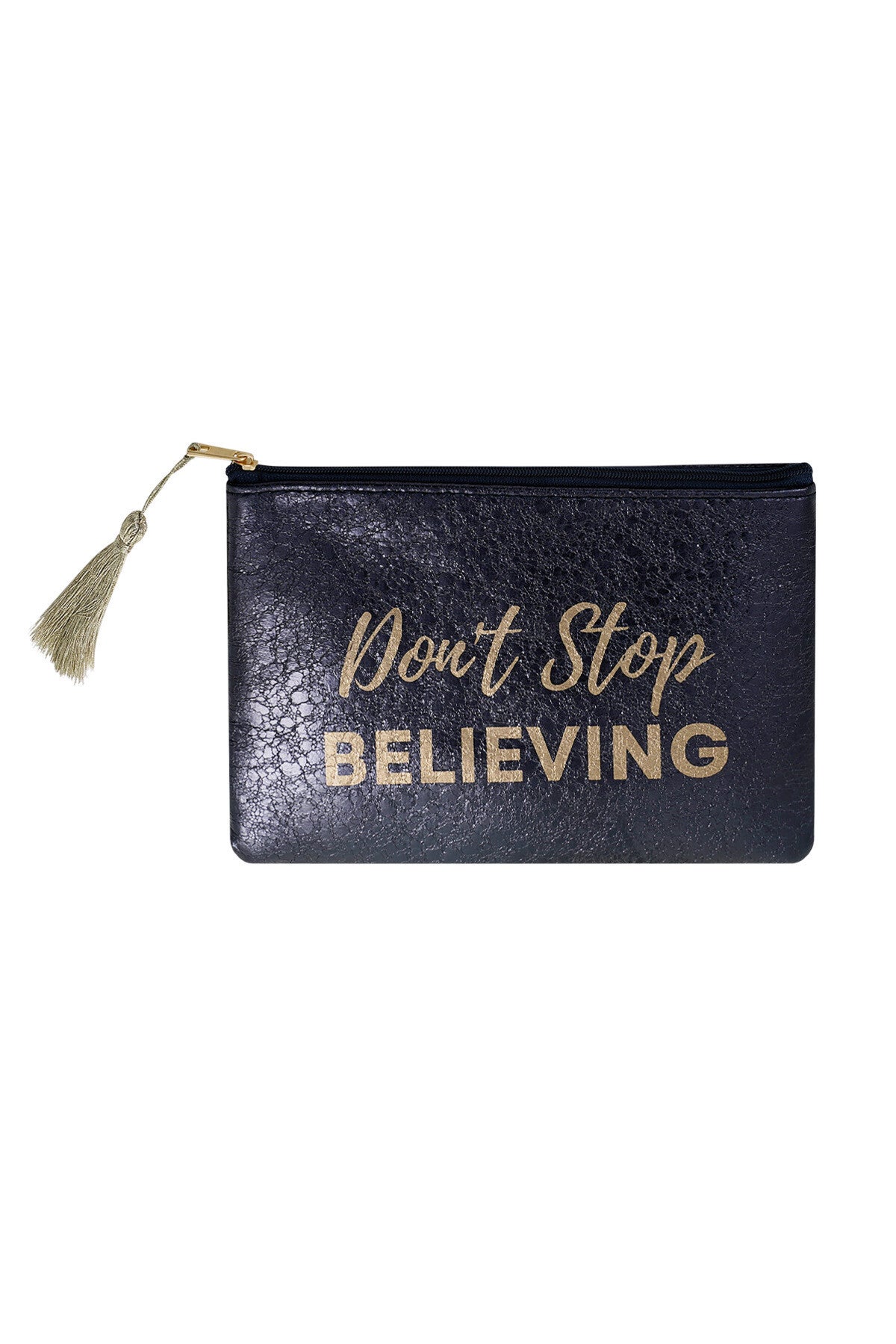 Mini pochette métallisées bleu marine avec imprimé doré : N'arretez pas d'y croire.